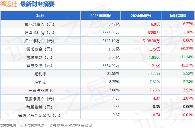发布日期:2025-05-21 23:50 点击次数:139据证券之星公开数据整理,近期德迈仕(301007)发布2024年年报。截至本报告期末,公司营业总收入6.9亿元,同比上升6.77%,归母净利润5398.0万元,同比上升1.18%。按单季度数据看,第四季度营业总收入1.67亿元,同比下降5.31%,第四季度归母净利润1302.25万元,同比上升13.52%。本报告期德迈仕公司应收账款体量较大,当期应收账款占最新年报归母净利润比达342.93%。